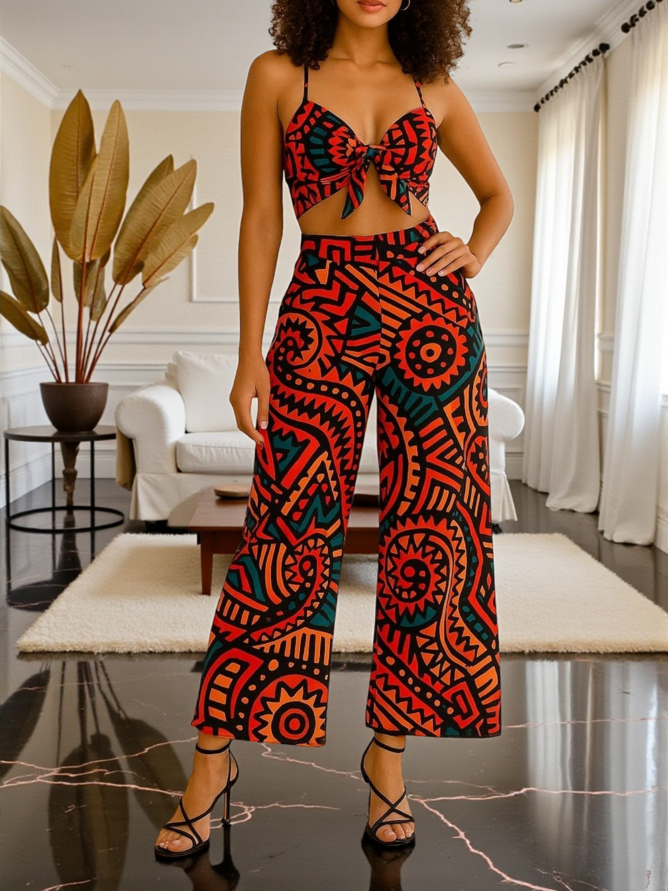 Atrévete a destacar con este set elaborado en tela noche de viena, una fibra suave, ligera y de caída elegante que realza tus curvas con total comodidad, su estampado vibrante y lleno de personalidad convierte cada paso en un declaración de estilo.